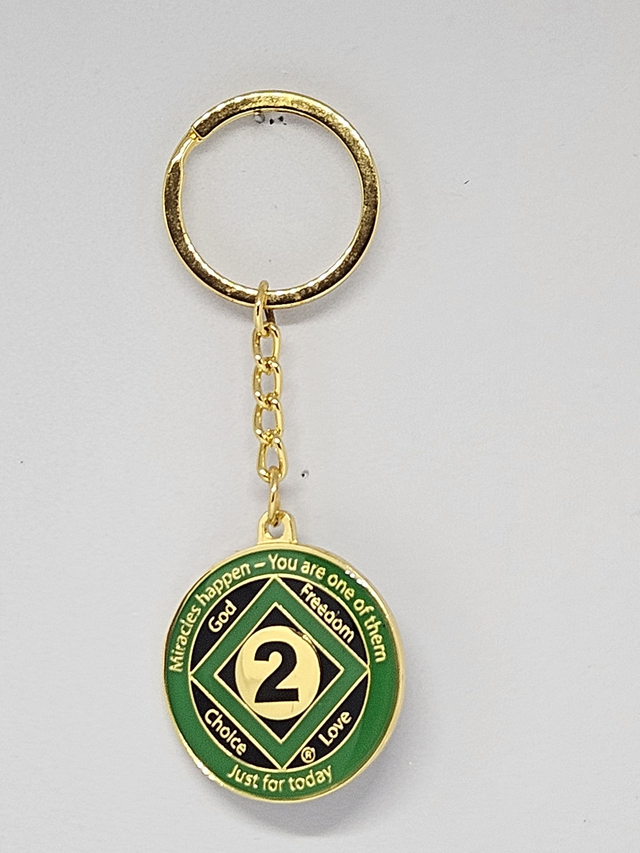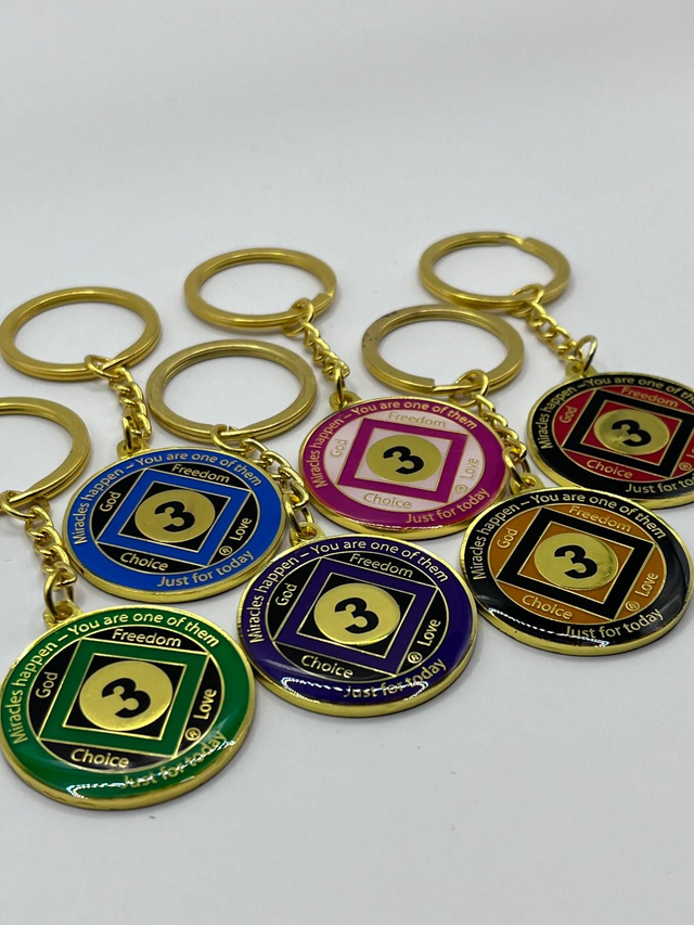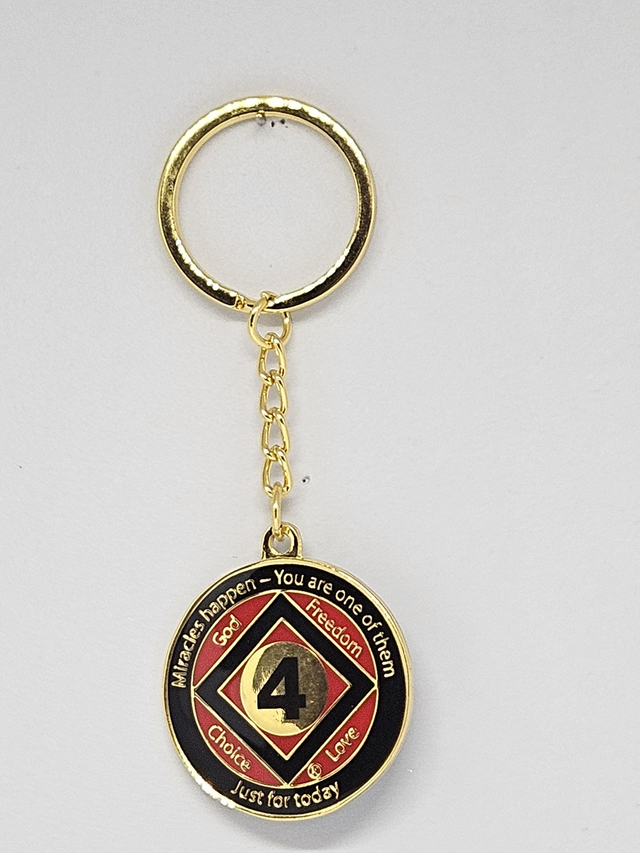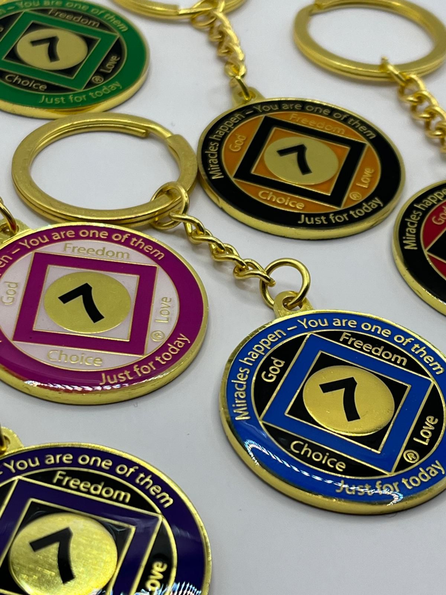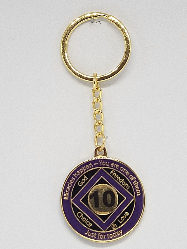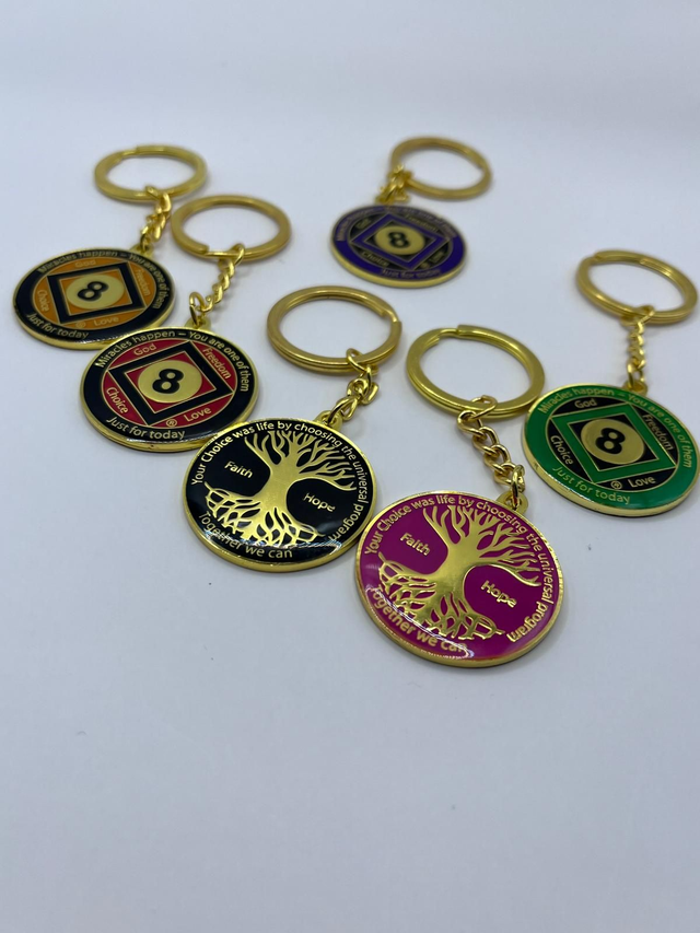 Porte-clés médaille NA en métal émaillé, finition dorée. Disponible en plusieurs couleurs et années de rétablissement. Design double face : symbole NA ou arbre de vie (Faith, Hope). Idéal comme cadeau de rétablissement ou pour célébrer une étape personnelle.