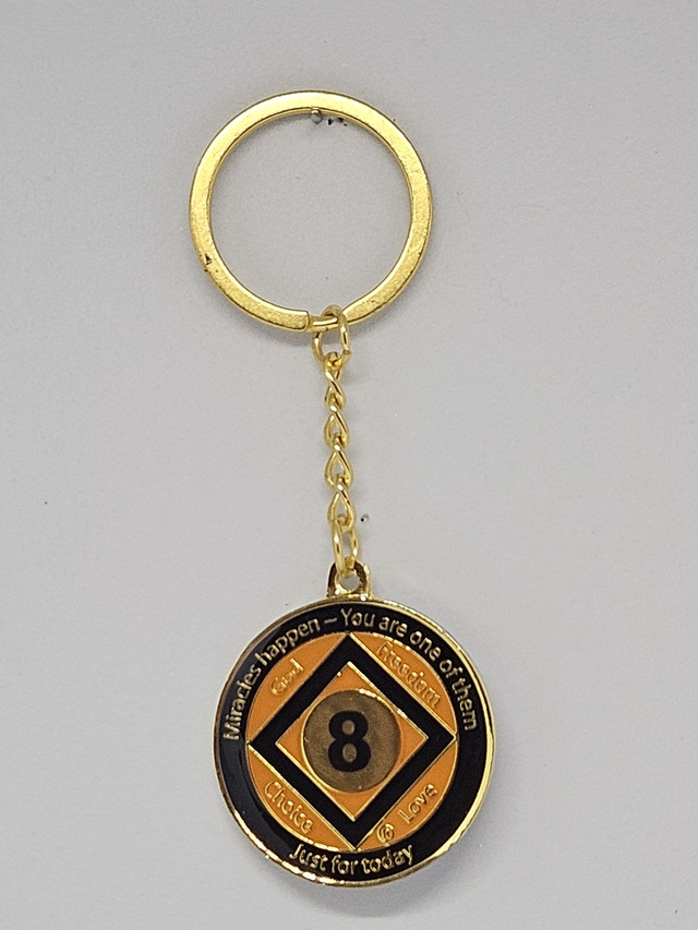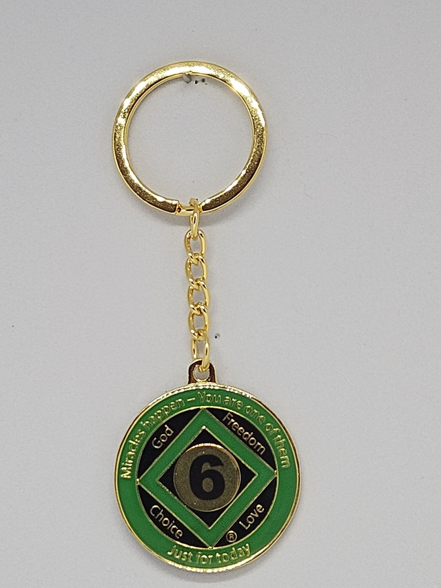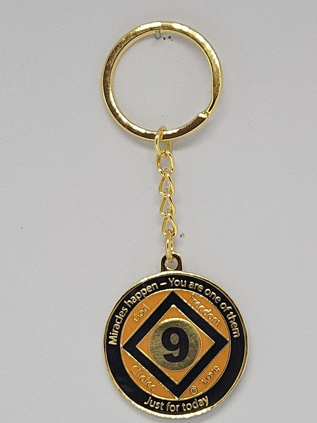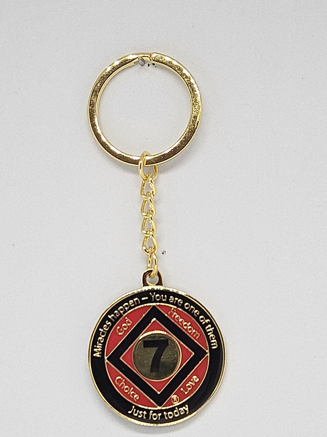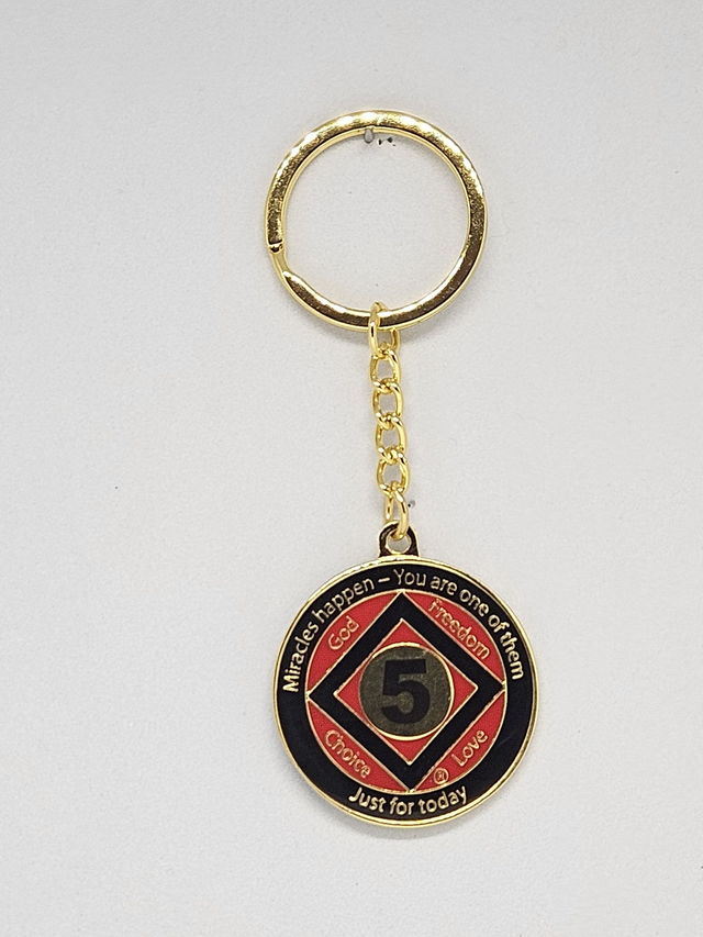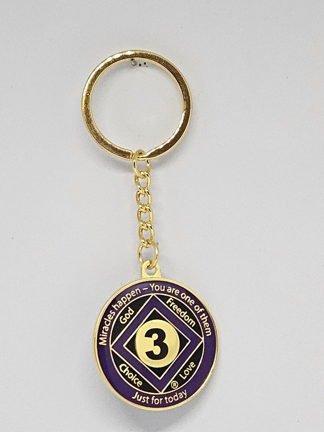 Porte-clés médaille NA en métal émaillé, finition dorée. Disponible en plusieurs couleurs et années de rétablissement. Design double face : symbole NA ou arbre de vie (Faith, Hope). Idéal comme cadeau de rétablissement ou pour célébrer une étape personnelle.